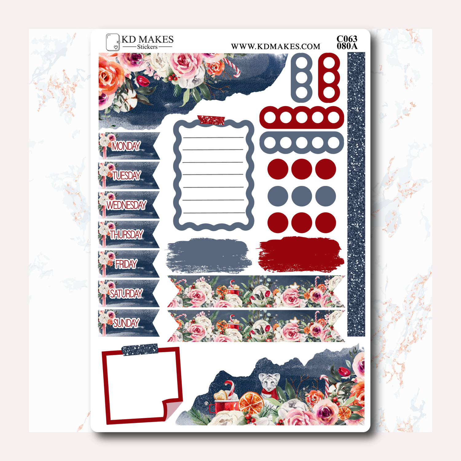 This collection features a combination of deep red and dark blue tones, accompanied by a festive collection of wintery florals and a white tiger motif. Perfect for the holiday season!